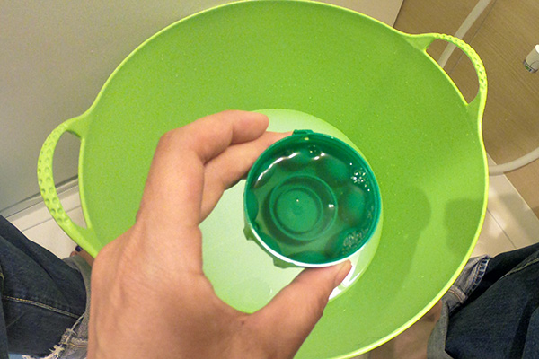 洗濯機使用の場合はボトル裏面の説明書き通りに、手洗いの場合は、処理するウエアが十分に浸せる水量を用意してください。