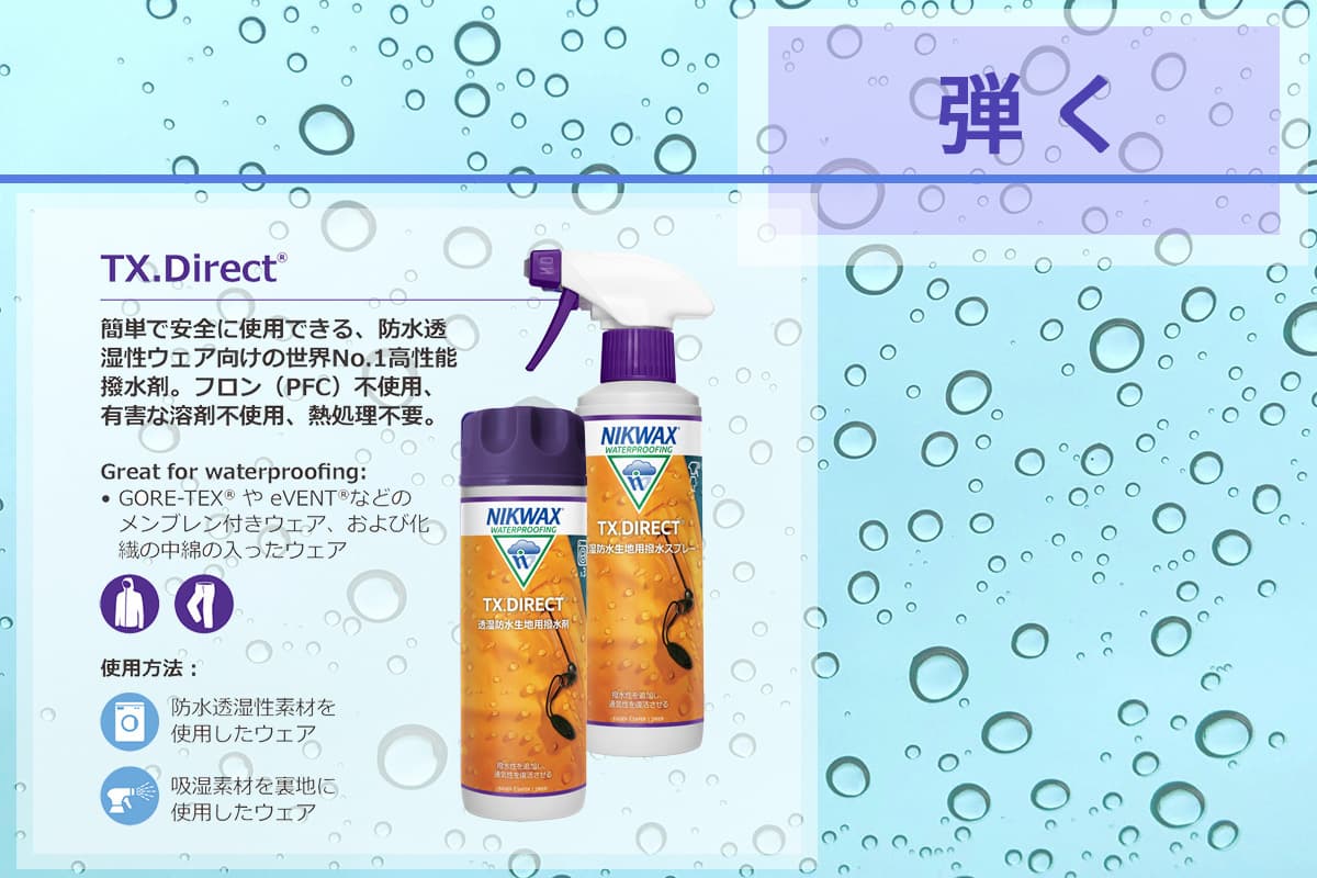 • TX.ダイレクトウォッシュインは持続性があります。撥水加工は、洗濯するごとに施さなくても大丈夫。着用の度合いにもよりますが、2~3回の洗濯に一度、TX.ダイレクトウォッシュインで撥水処理をしてください。