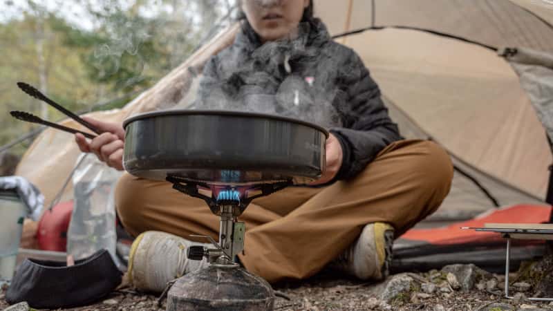 雄大な眺めの中で、美味しい食事を楽しむための食材と器具に振り分けたり。